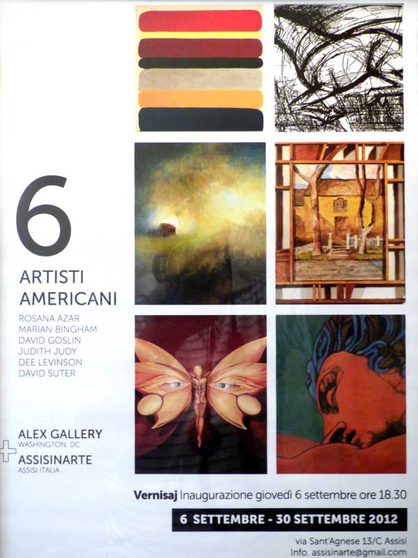 6 Artisti Americani. Assisinarte; Assissi, Italy. September 6–30, 2012 Gallerie Viecelles; Paris, Marais District, France. August 1–15, 2012 with other Gallery A artists Strictly Painting 9. McLean Project for the Arts; McLean, Virginia. June 13–August 3, 2013